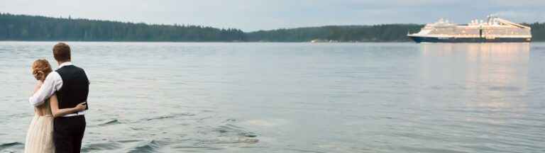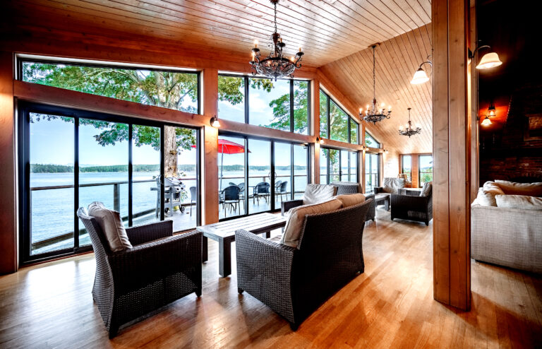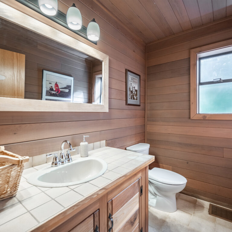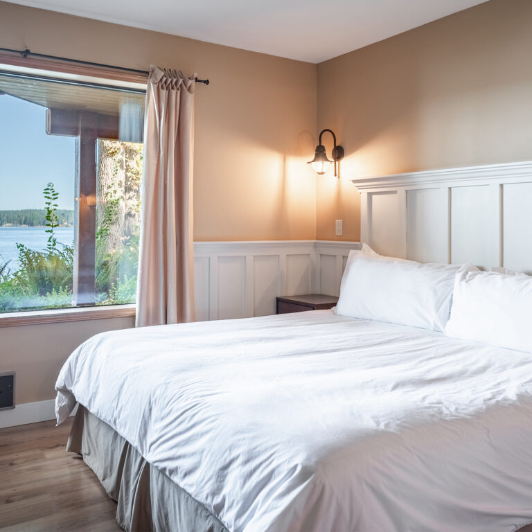Beautifully furnished with a spectacular view of Discovery Passage and the Coast Mountain range, this lodge offers every comfort and is ideal for families and groups. When rented for accommodations (and not during wedding stays), the main level offers a spacious open-concept living space with a grand brick wood-burning fireplace and a gourmet kitchen. Four oceanview bedrooms each come equipped with their own bathroom, sitting area, and plasma screen TV. The two lower-level bedrooms have two king beds in each, while the third lower-level bedroom has a king and a double bed. On the main level, the exterior entrance fourth bedroom features two double beds and a cozy fireplace. The lodge is wheelchair accessible.